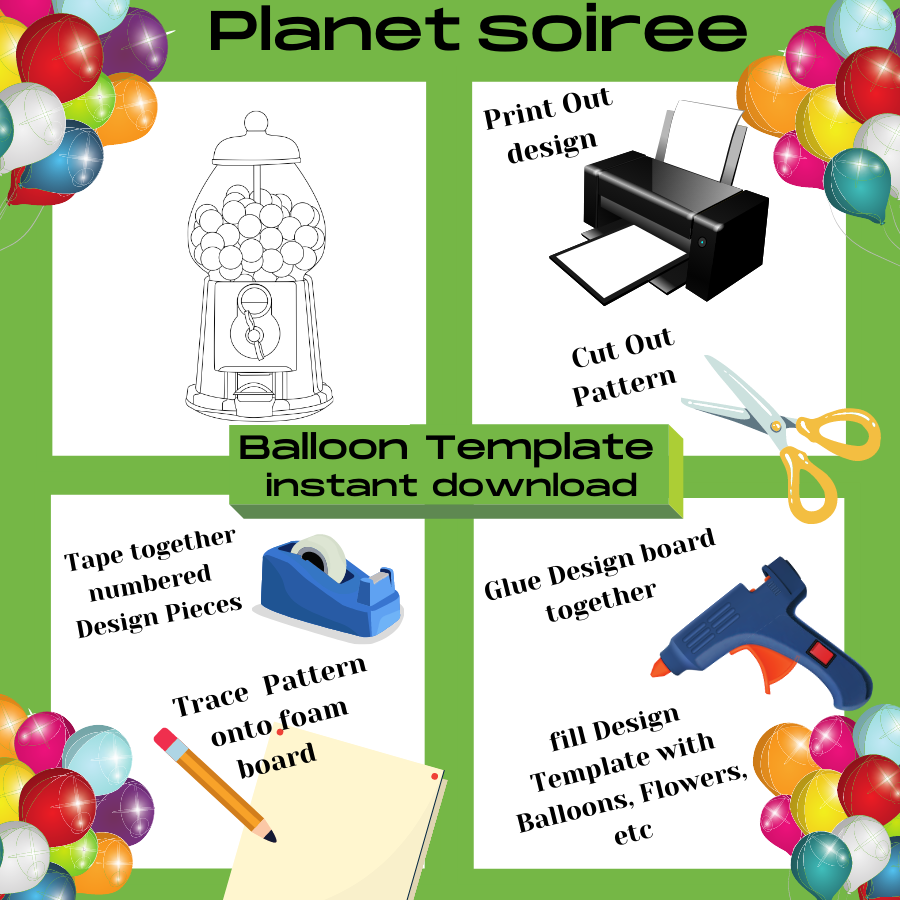 Balloon Mosaic: This personalized party decoration is perfect for your child’s birthday party. Looking for a unique and easy way to decorate for your next party? Look no further than the Balloon Mosaic Template! "Candy GumBall Machine. Planet Soiree's Balloon templates allow you to create a one-of-a-kind Balloon Mosaic that is sure to impress your guests. The best part is, it's very easy to do! Simply print out the design, cut out the pieces, and tape them together. Then trace the design onto foam board, and glue the pieces together. Finally, fill it with balloons or flowers and you're all set! Our design pattern can be used in many ways. Use to create the perfect Piñata, make with plywood for a party prop. With this Balloon Mosaic Template, you'll be able to create a beautiful decoration that will make your next event unforgettable! Additional matching Candy GumBall Machine” Products are also available. Thank you for choosing us!