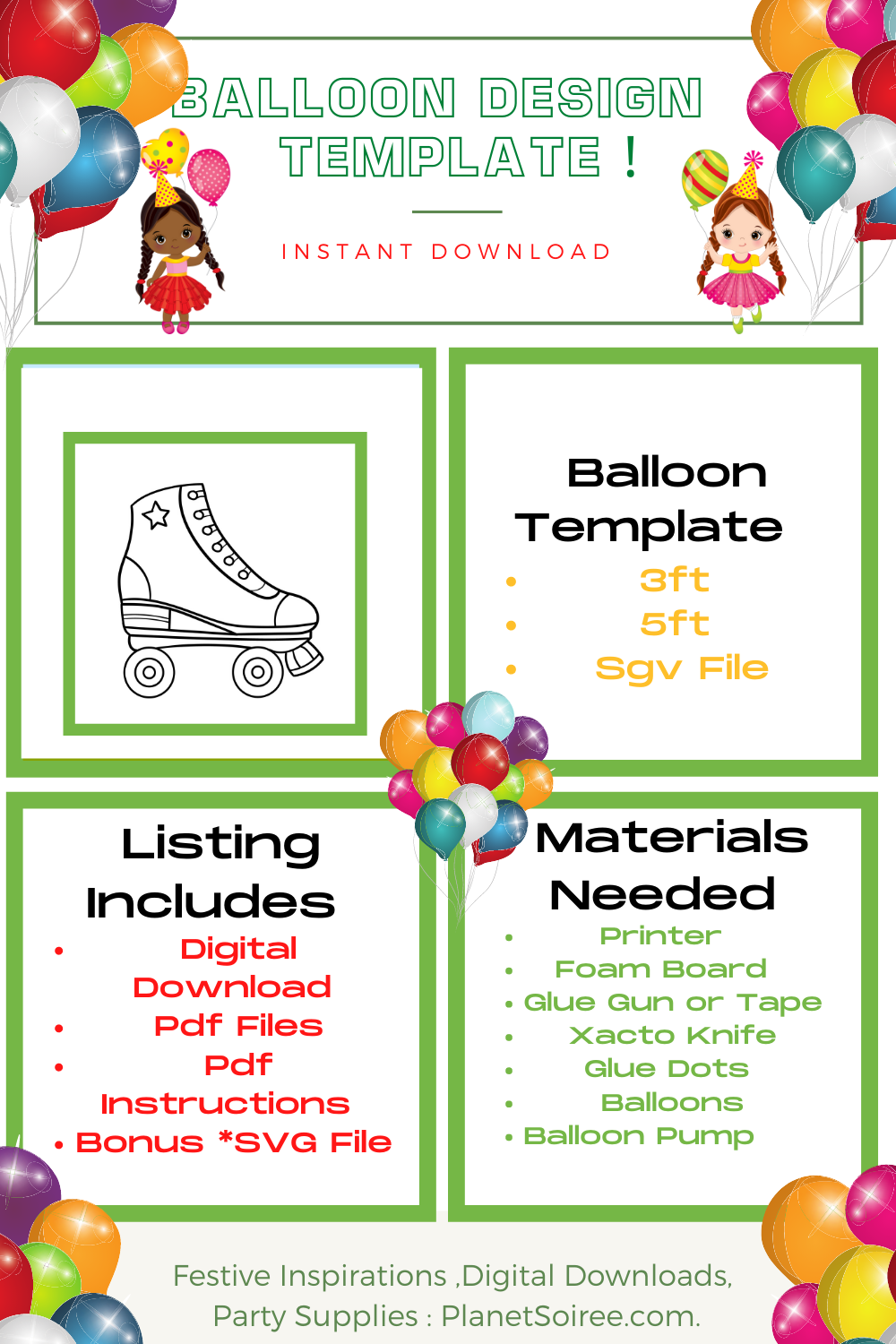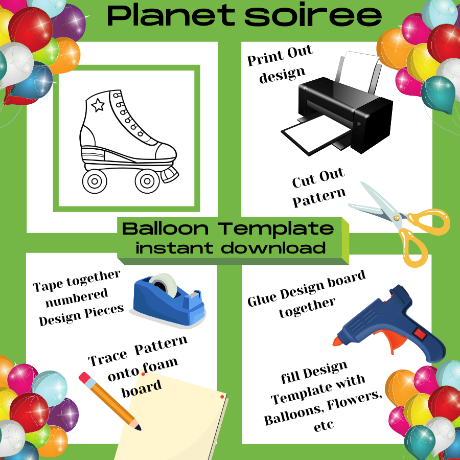 Balloon Mosaic: This personalized party decoration is perfect for your child’s birthday party. Looking for a unique and easy way to decorate for your next party? Look no further than the Balloon Mosaic Template! " Roller skate Template. Planet Soiree's Balloon templates allow you to create a one-of-a-kind Balloon Mosaic that is sure to impress your guests. The best part is, it's very easy to do! Simply print out the design, cut out the pieces, and tape them together. Then trace the design onto foam board, and glue the pieces together. Finally, fill it with balloons or flowers and you're all set! Our design pattern can be used in many ways. Use to create the perfect Piñata, make with plywood for a party prop. With this Balloon Mosaic Template, you'll be able to create a beautiful decoration that will make your next event unforgettable! Additional matching on Roller skate Template” Products are also available. Thank you for choosing us!